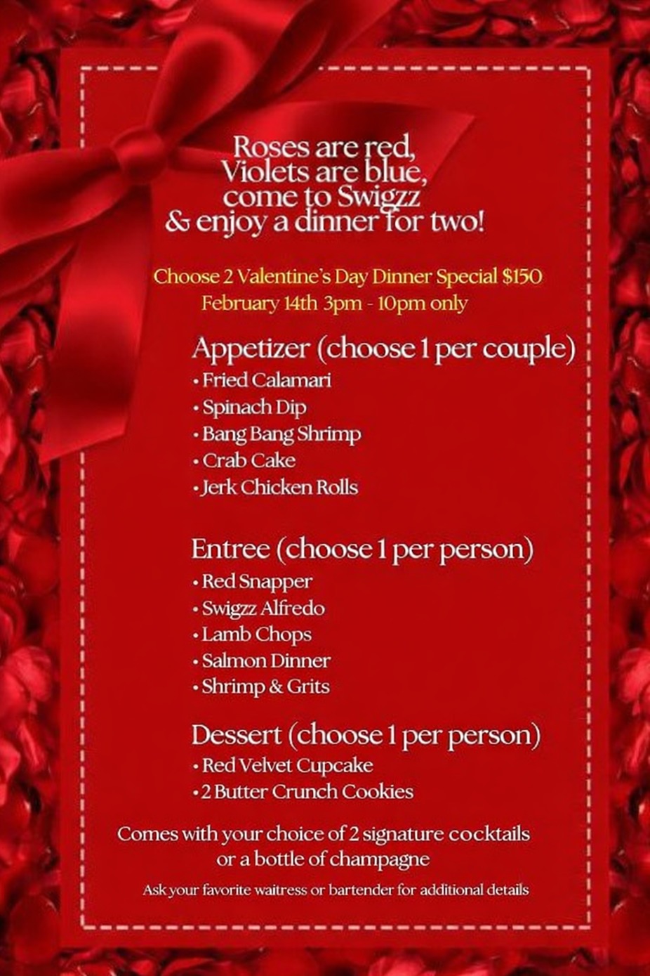 Celebrate your Valentine's Day at Swigzz. Choose 2 VDay Special $150 per couple.